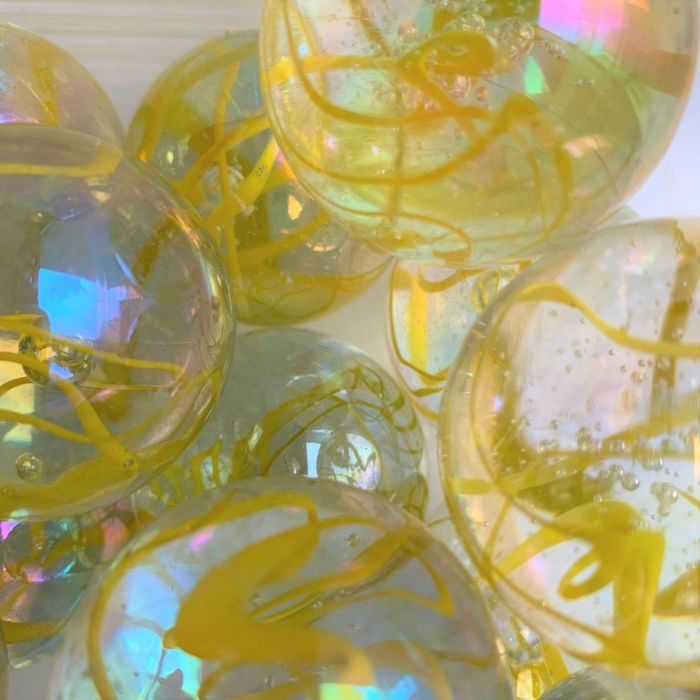 Bille transparente avec des fils colorés à l'intérieur de la bille. Ces grosses billes sont finies avec un revêtement irisé. Un revêtement irisé crée un effet brillant et nacré avec des changements de couleur lorsque l'angle d'incidence de la lumière ou de l'éclairage change.