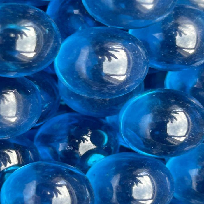 Vitrocerle bleu transparent. Ces petites billes sont souvent utilisées comme décoration ou comme couche de fond pour l'aquarium.