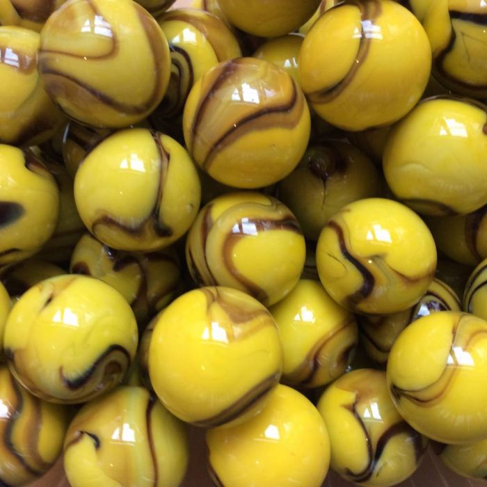 Bille translucide jaune ornée de rayures brunes.