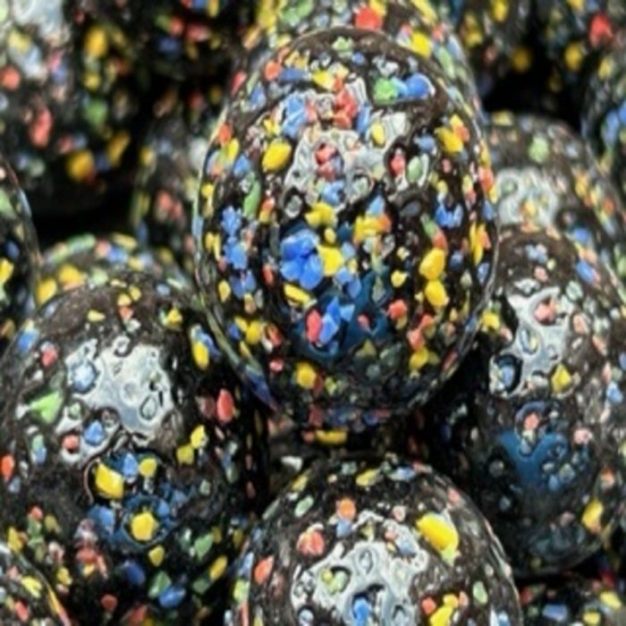 Bille noire brillante finie avec des éclats de verre de couleurs vives. Cela donne à la bille une surface irrégulière et rugueuse.