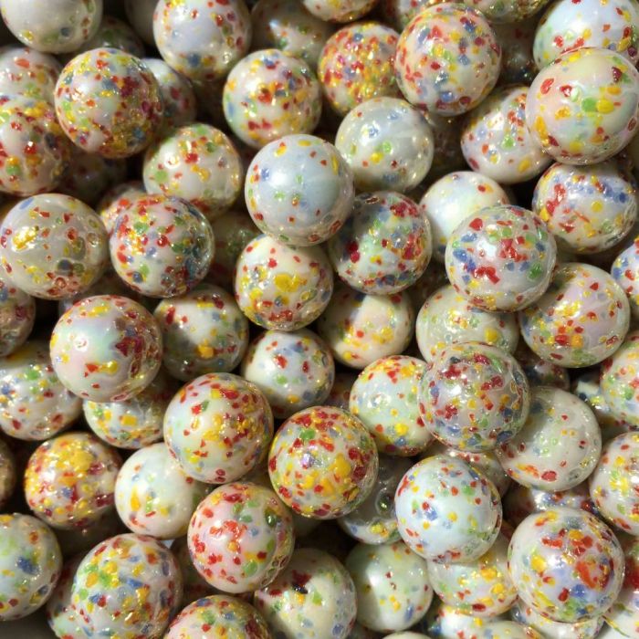 Bille blanche translucide finie avec des éclats de verre de différentes couleurs. Après la fabrication de la bille, la surface est à nouveau chauffée et roulée dans les éclats de verre colorés. Cela donne à la bille une surface irrégulière.
