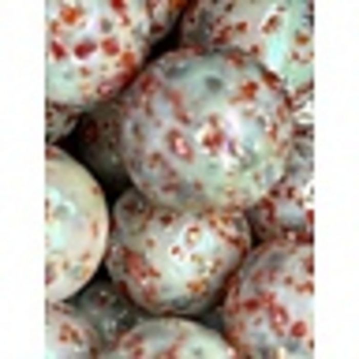 Undurchsichtige, weiße Glasmurmel mit eingeschmolzenen Glaskrümelchen in verschiedenen Farben (blau, grün, orange, gelb, rot...).