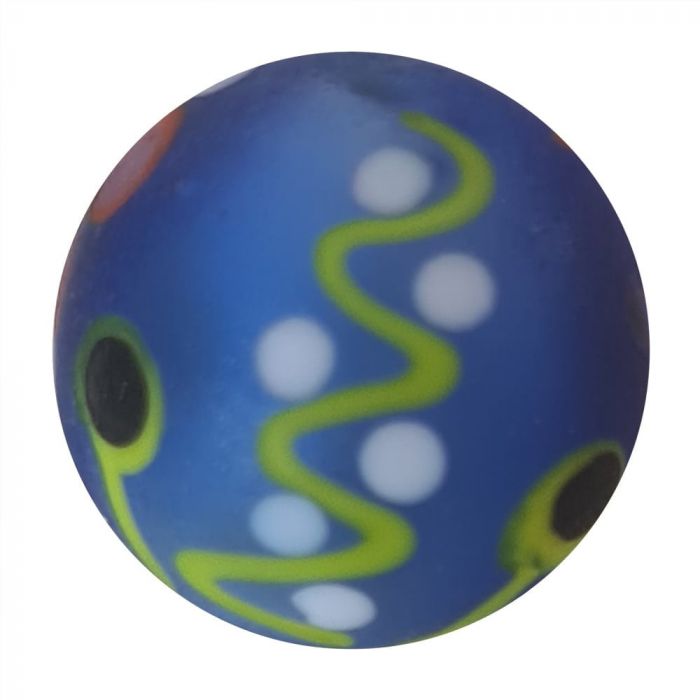 Cette bille faite à la main a une base bleu transparent et est décorée de lignes et de symboles de différentes couleurs vives. La surface de la bille est traitée pour la rendre mate.