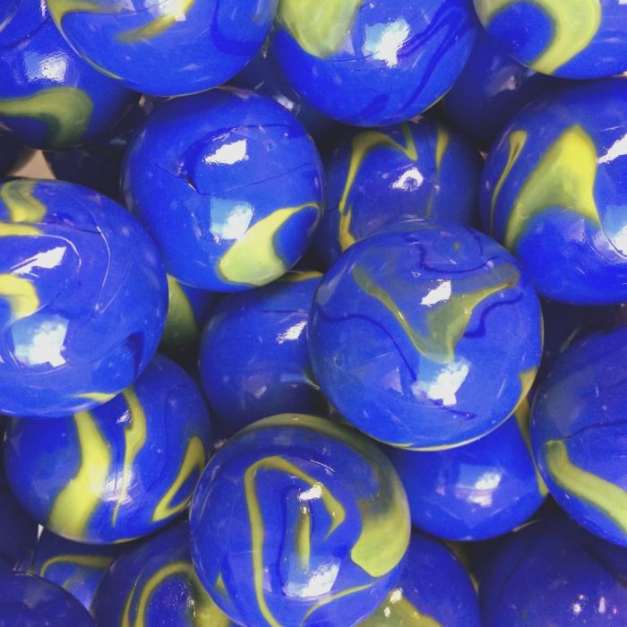 Grosse bille bleue opaque avec des lignes jaunes sur la surface.