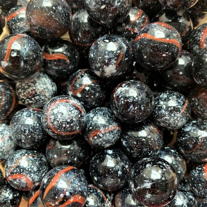 Marbre noir opaque avec des rayures rouges et des taches blanches sur la surface.