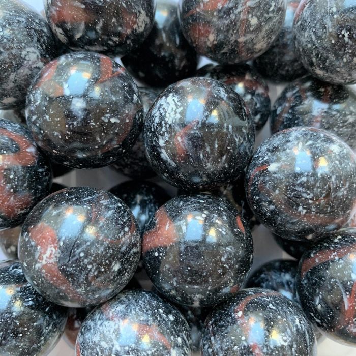 Bille noire ornée de mèches rouges et de taches blanches.