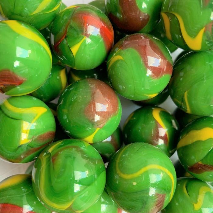 Bille transparente verte avec des traînées jaunes et rouges à la surface.