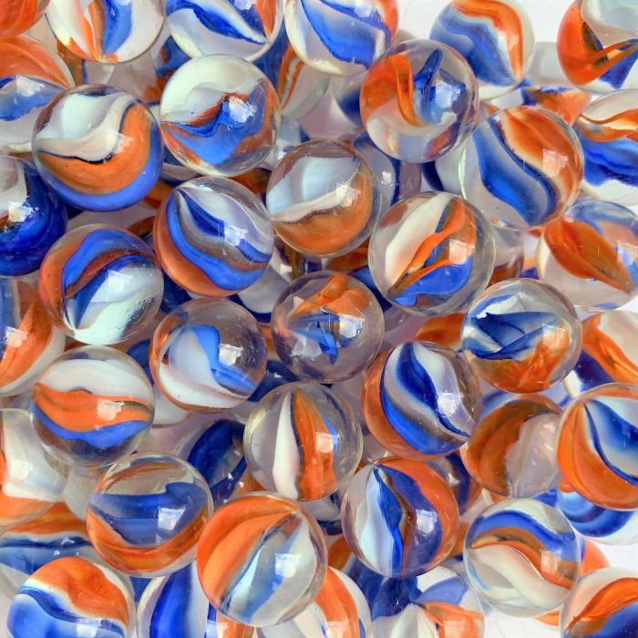 Bille transparente avec à l'intérieur une "plume" typique tricolore. La plume combine les couleurs blanche, rouge et bleue.