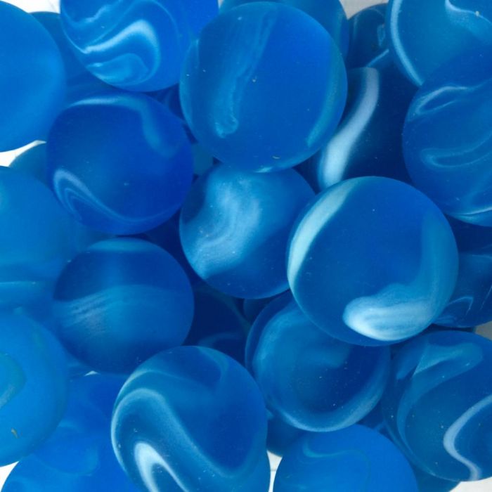 Ce petit billes a une surface mate et est fabriqué en verre bleu glace transparent avec des tourbillons blancs.