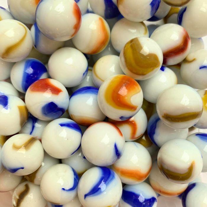 Bille blanche transparente ornée de taches bleues et jaune moutarde ou rouge-brun alternées. Les différentes couleurs sont fournies mélangées.
