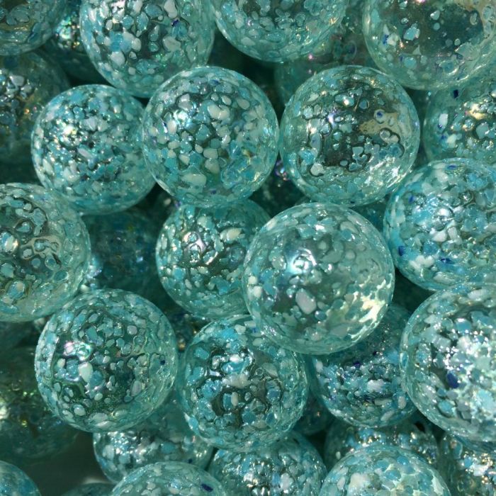 Bille transparente finie avec des éclats de verre bleu clair fondus à sa surface. Cela donne à la bille une surface irrégulière et rugueuse.