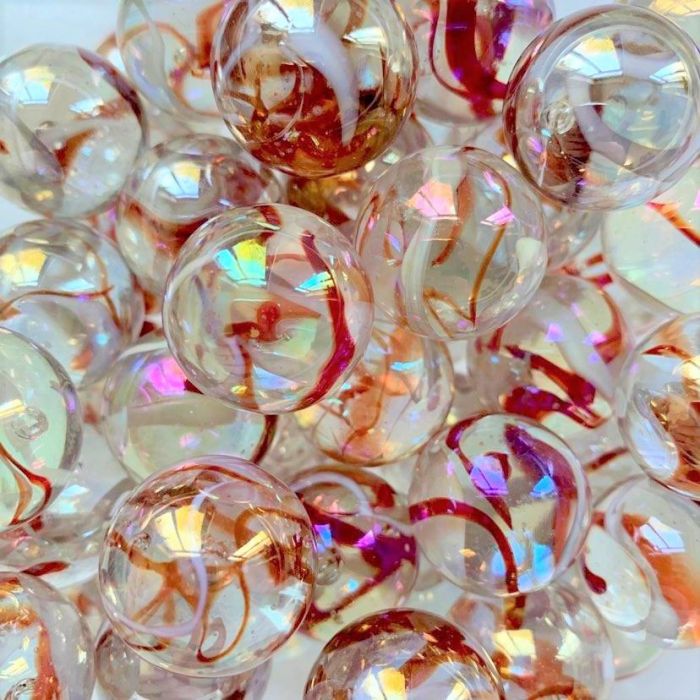 Bille transparente avec des filaments blancs et rouges à travers la bille. Ces billes sont finies avec un revêtement nacré.