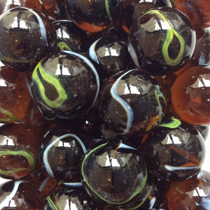 Ces billes, nommées d'après le monstre marin mythique, sont fabriquées en verre transparent ambré avec des traînées blanches et vertes qui courent à la surface et à travers la bille.