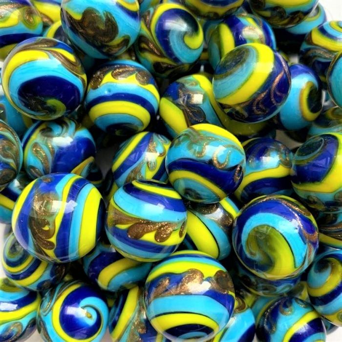 Ces billes possèdent un cœur translucide recouvert d'une spirale de verre jaune, bleu clair et bleu foncé. La spirale est interrompue par un gracieux motif de vague en poudre d'or.