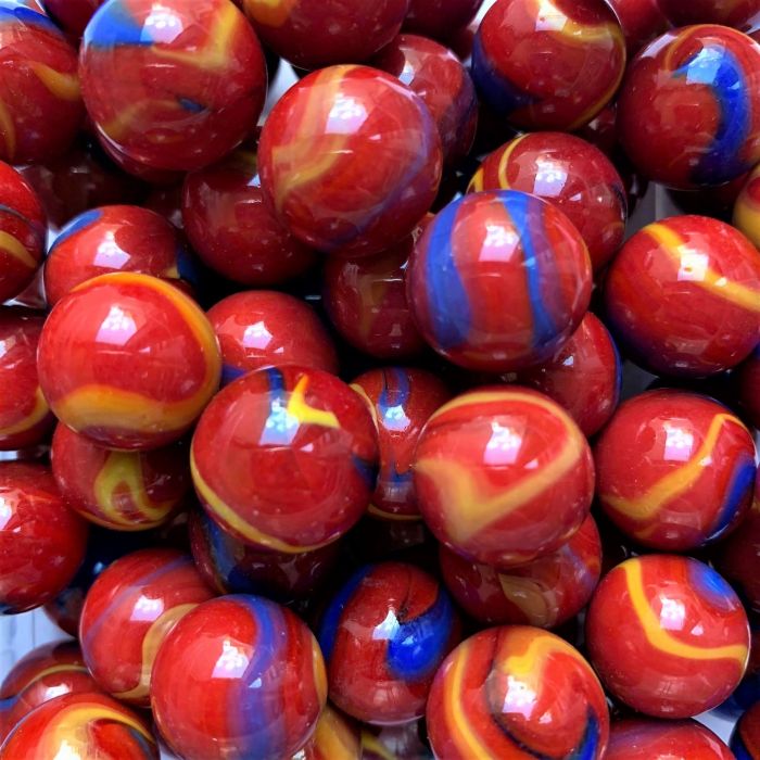 Bille translucide orange-rouge. Ces petites billes sont finies avec des rayures bleues et jaunes.