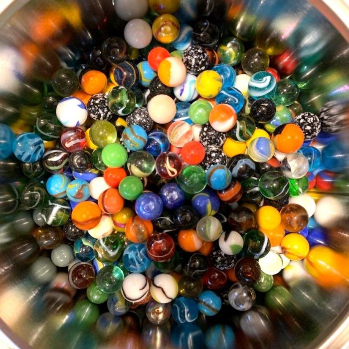 Ce paquet contient un mélange hétéroclite de pas moins de 1000 billes d'un diamètre de 12 à 18 mm. Les billes sont emballées dans un seau en métal.