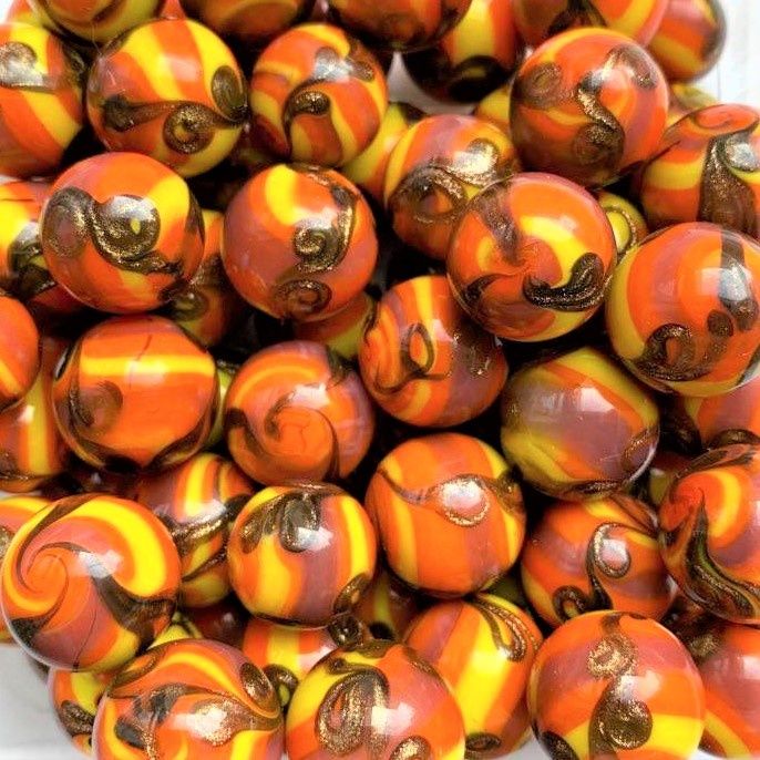 Les billes possèdent un cœur translucide recouvert d'une spirale de verre orange, jaune et lilas. La spirale est interrompue par un gracieux motif en poudre d'or.