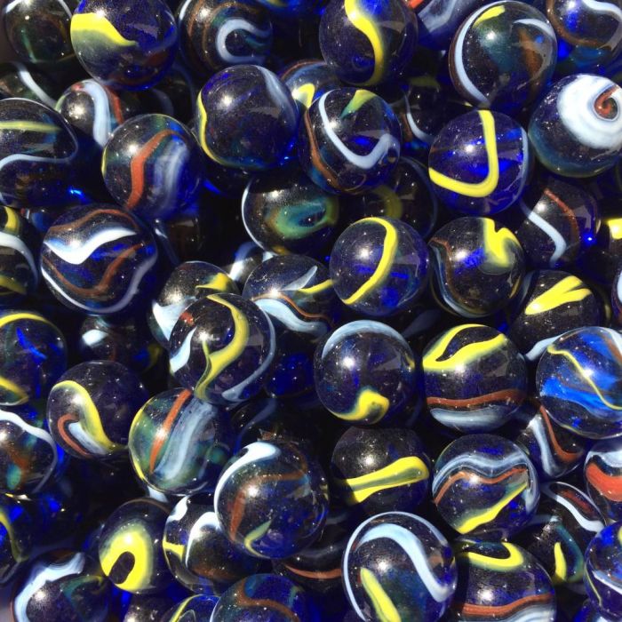 Michel-Ange est une bille bleu translucide avec des filaments jaunes, rouges et blancs.