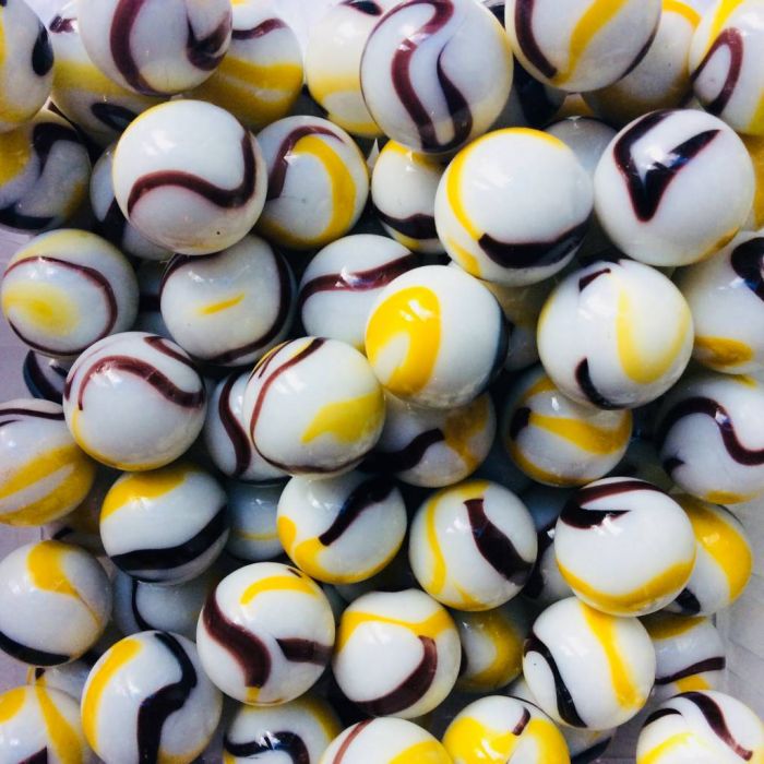 Bille blanche translucide ornée de rayures brunes et jaunes.