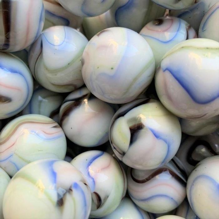 Bille blanche transparente avec des filaments colorés à la surface. Les filaments évoquent un sentier de montagne, un cours d'eau,... qui tournent autour d'une montagne.