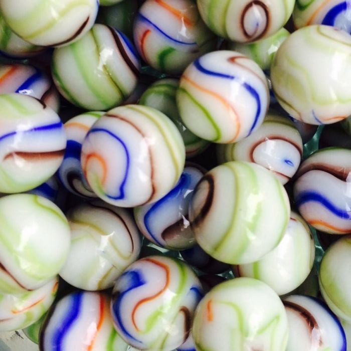 Marbre blanc transparent avec des traînées orange, marron, bleues et vertes à la surface.