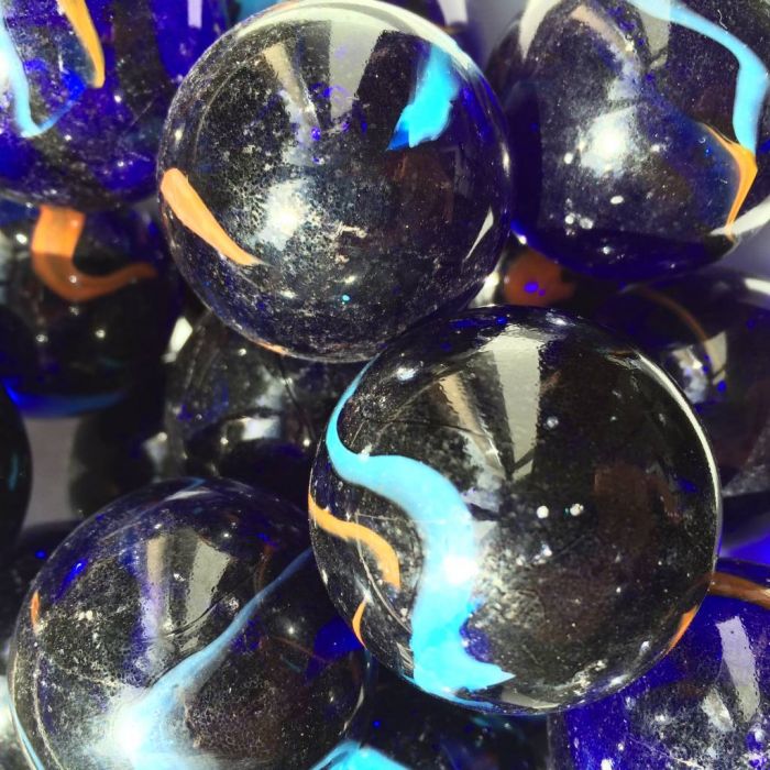 Bille bleu foncé transparente avec des tourbillons bleu clair et orange à la surface.