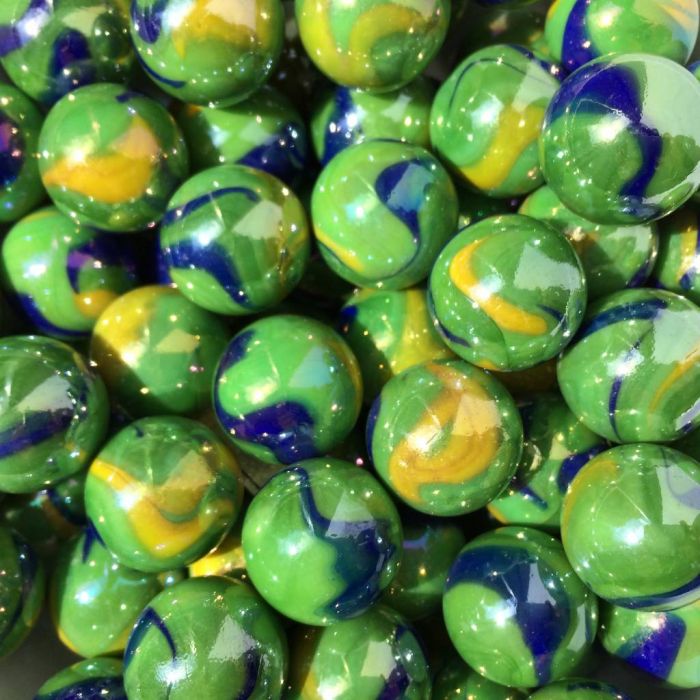 Bille verte translucide avec des rayures jaunes et bleues. Ces billes sont finies avec un éclat nacré.