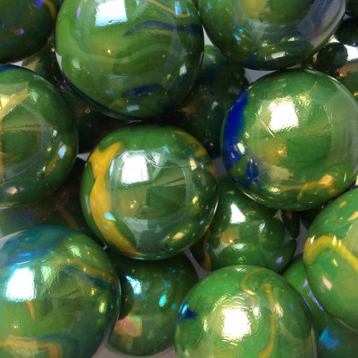 Bille verte translucide avec des rayures jaunes et bleues, finie avec une belle nacre.