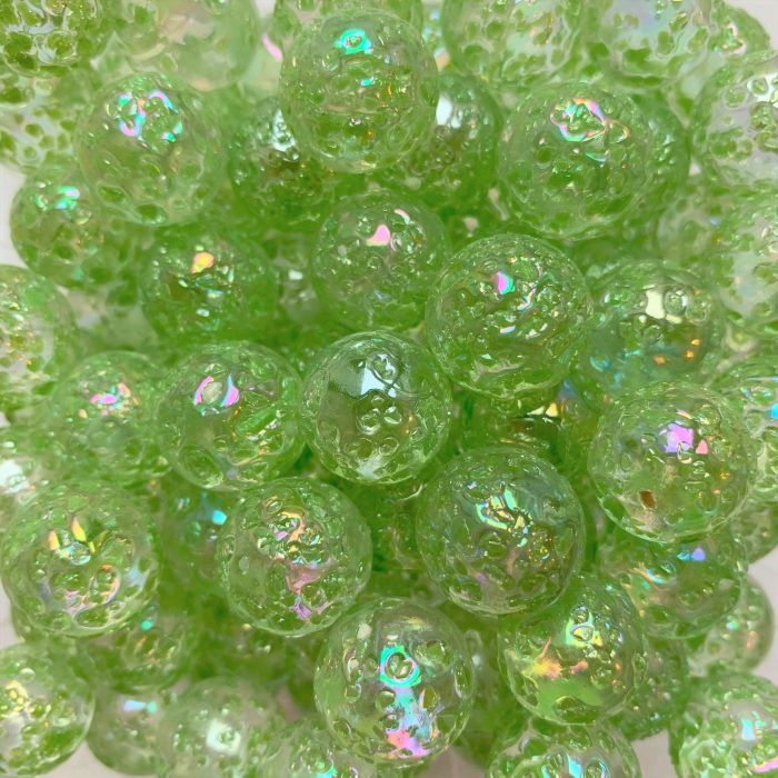 Bille transparente finie avec des éclats de verre verts. Après la fabrication de la bille, la surface est à nouveau chauffée et roulée dans des éclats de verre. Cela donne à la bille une surface irrégulière.