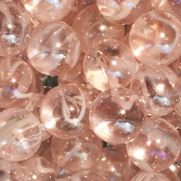 Bille rose translucide avec des filaments blancs à la surface et à l'intérieur de la bille. Cette bille élégante est finie avec un éclat nacré.