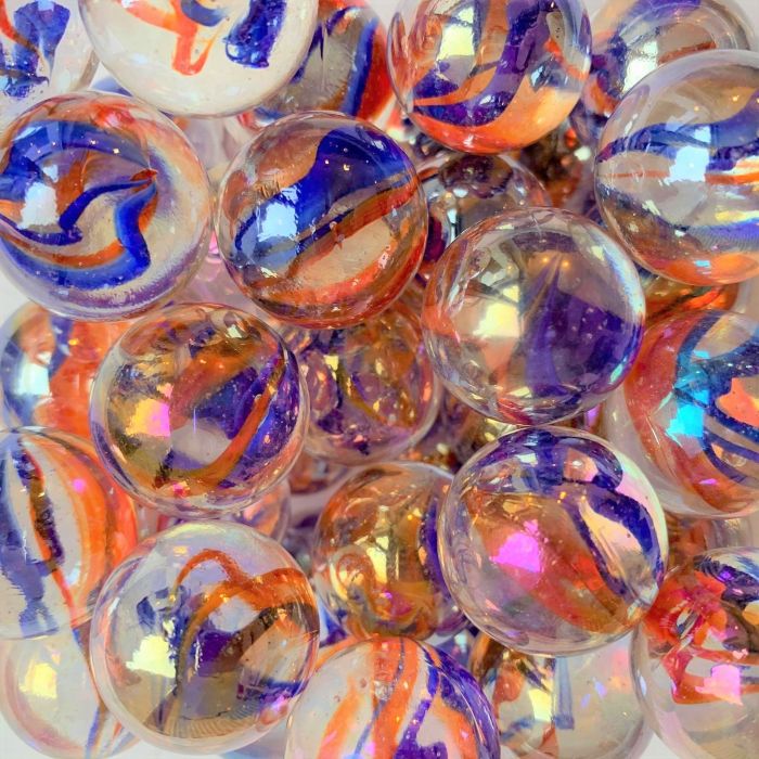 Bille transparente avec une flamme rouge et bleue à l'intérieur. Cette bille est finie avec un revêtement irisé qui la fait briller encore plus magnifiquement!