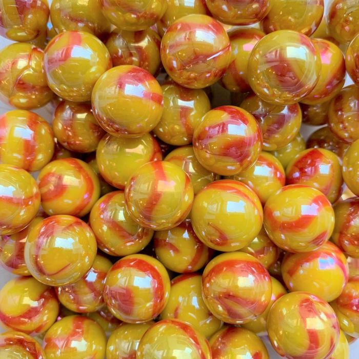 Bille jaune transparente avec des rayures rouges sur sa surface. Ces billes sont finies avec une nacre irisée.
