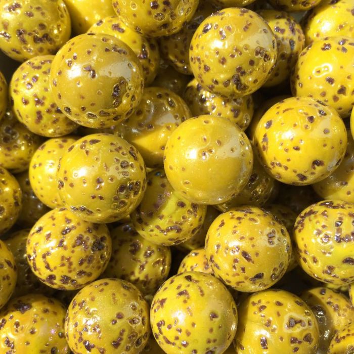 Bille jaune brillant fini par des galets de verre de couleur brune. Cela donne au marbre une surface irrégulière et rugueuse.