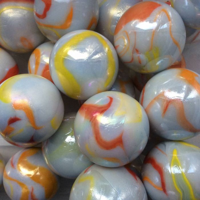 Bille blanche transparente avec des rayures jaunes et orange sur la surface.